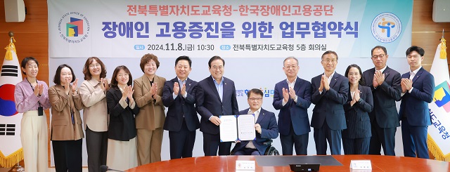 서거석 교육감과 이종성 이사장은 8일 교육청 5층 회의실에서 양 기관 관계자 10여 명이 참석한 가운데 ‘장애인 고용증진을 위한 업무협약’을 체결했다.