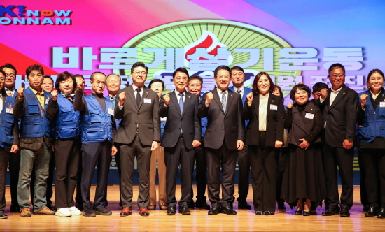 열린 전진대회는 김영록 지사와 박주영 바르게살기운동 전남협회장을 비롯해 각 시·군 회원 900여 명이 참석한 가운데 행동강령 낭독, 온기나눔 장학금 전달, 유공회원 표창, 성과보고, 포퍼먼스 순으로 진행됐다.