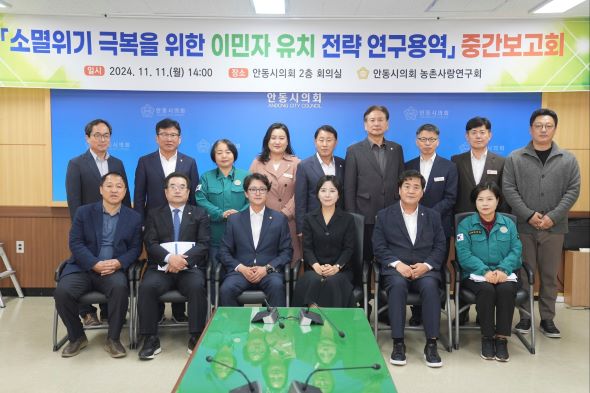 (경북=NSP통신) 김오현 기자 = 안동시의회 의원연구단체 농촌사랑연구회는 11일 오후 2시 연구회 소속 의원과 집행부 담당 공무원 등 20여 명이 참석해 ‘소멸위기 극복을 위한 이민자 유치 전략 연구용역’의 중간보고회를 개최했다.