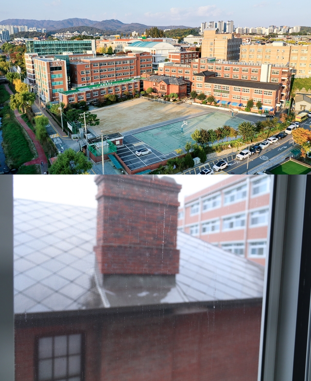 수원시 팔달구 소재 삼일중학교(위)와 학교에 설치된 방진망 위로 빗물이 들이치지 않고 흘러내리고 있다. (사진 = 조현철 기자)