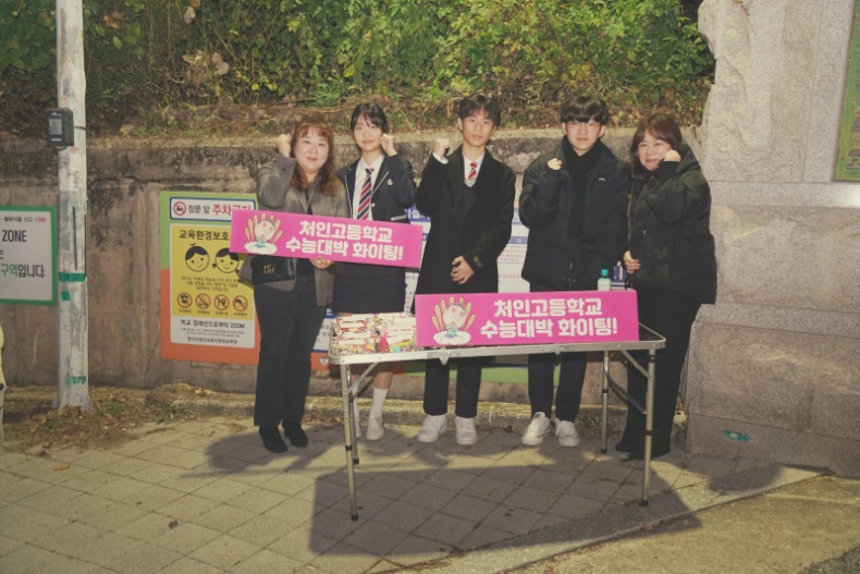 이날 오전 6시 35분경 용인고등학교 선생님이 용인고 정문 앞에 배치되고 주변에는 용인시 처인고등학교 학생과 학부모들이 나와 수능 대박을 응원하며 일부 수험생들에게 ‘시험 잘 보라며 파이팅’을 외치고 미리 준비한 핫팩과 사탕이 들어있는 봉지를 건넸다.
