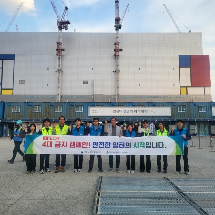 아울러 13일 고용노동부 평택지청, 안전보건공단 경기남부지사, 더조은관광은 삼성전자 평택 건설현장의 버스 승하차장에 모여 슬로건이 부착된 버스에 탑승하는 퇴근근로자들을 대상으로 ▲안전장치 해제 금지 ▲모르는 기계 조작 금지 ▲보호구 없이 작업 금지 ▲작동 중인 기계 정비 금지’ 등 4대 금지 캠페인 리플렛과 다가오는 혹한기에 건설 근로자들을 위한 넥워머, 핫팩 등 다양한 홍보물품을 전달했다.