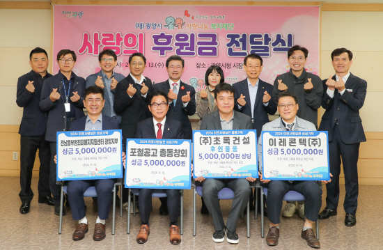 기탁식에서는 ▲포철공고 총동창회(회장 김명훈)가 500만 원의 후원금 ▲전남동부범죄피해자지원센터 광양지부(지부장 김형원)가 500만 원의 후원금 ▲이레콘텍(대표이사 구춘원)이 500만 원의 후원금 ▲초록건설(대표 손병완)에서 후원품 500만 원 상당을 전달하며 지역 사회를 위한 나눔을 실천했다.