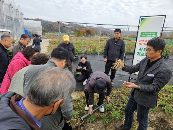 이번 기술 교육은 지난 3월 19일 잔대발전연구회 회원들이 실증 시험구를 설치해 파종한 잔대의 생육 상태와 종근을 관찰하고 우량 종근 생산을 위한 기술 정보를 교류하는 자리로 마련됐다.