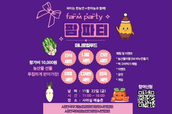 이번 팜파티는 한국후계농업경영인광양시연합회(회장 이기욱)와 한국여성농업인광양시연합회(회장 김선옥)가 주관하는 행사로 지역농산물을 주제로 먹거리, 볼거리, 즐길거리 등 다양한 콘텐츠가 마련돼 있다.