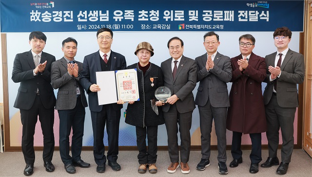이에 전북교육청은 29년간 학생 교육에 헌신한 고인의 뜻을 기리고 고인의 가족을 위로하기 위해 이날 근정포장 전수식과 함께 공로패 전달식을 개최했다.