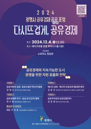 (경기=NSP통신) 김여울 기자 = 경기 광명시(시장 박승원)가 12월 4일 일직동 테이크호텔 루미나스홀에서 ‘2024년 광명시 공유경제 활성화 공공(共拱) 포럼’을 개최한다.