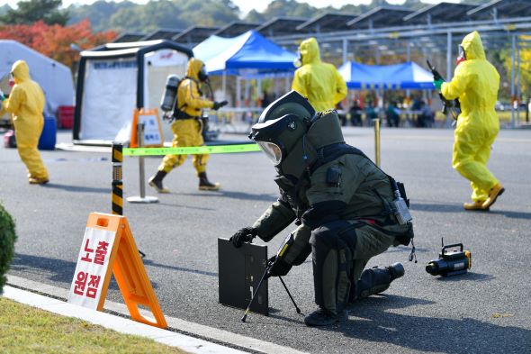 훈련은 ▲경찰의 신고 접수 및 상황 전파 ▲초동대응 조치 ▲환경 검체 채취 및 이송 ▲노출자 인체 제독 ▲역학조사 ▲오염 지역 환경 제독 ▲테러범 검거 및 언론 브리핑 등 각 기관이 맡은 역할을 신속하고 정확히 수행해 높은 평가를 받았다.