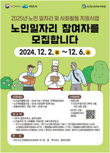 (전남=NSP통신) 서순곤 기자 = 여수시는 2025년 노인일자리 및 사회활동 지원사업 참여자 9300명을 12월 2일부터 12월 6일까지 모집한다고 28일 밝혔다.