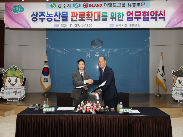 (경북=NSP통신) 김대원 기자 = 상주시(시장 강영석)는 지난 27일 시청 대회의실에서 상주농산물 판로확대 및 유통활성화를 위해 이랜드그룹 유통부문과 업무협약을 체결했다.
