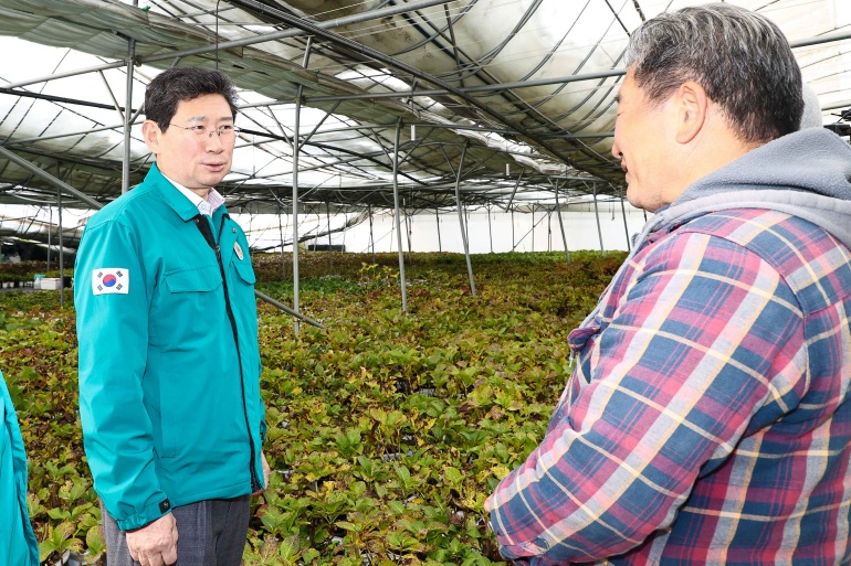 NSP통신-이상일 용인특례시장이 29일 남사읍 진목리의 한 화훼 농장을 방문해 피해 상황을 살피고 농장주에게 위로의 말을 전하고 있다.