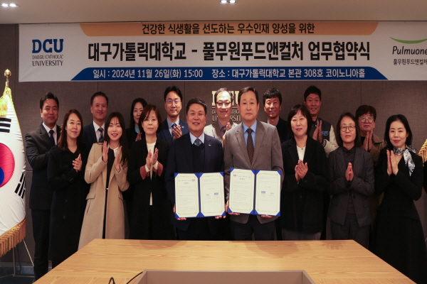 (경북=NSP통신) 김대원 기자 = 대구가톨릭대(총장 성한기)는 지난 11월 26일 교내 코이노니아홀에서 풀무원푸드앤컬처(대표이사 이동훈)와 우수 인재 양성을 위한 업무협약을 체결했다.
