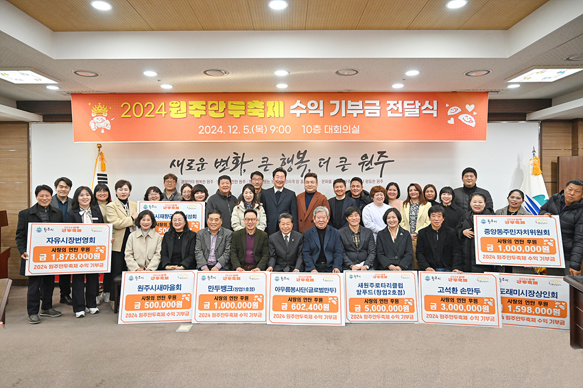 원강수 시장은 “포용·배려·화합의 상징인 2024 원주만두축제의 사회적 책임 실현과 가치 있는 메시지를 몸소 실천해 주신 기부자 여러분께 감사드린다”며 “추운 겨울을 보내고 있는 어려운 이웃들에게 오늘의 따뜻한 마음을 잘 전달하겠다”고 말했다.
