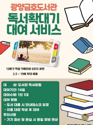 (전남=NSP통신) 김성철 기자 = 광양시는 ‘2024년 공공도서관 독서보조기기 지원 사업’의 사업 수행기관으로 선정된 광양금호도서관에서 독서보조기기 설치 및 대여 서비스를 추진한다고 밝혔다.