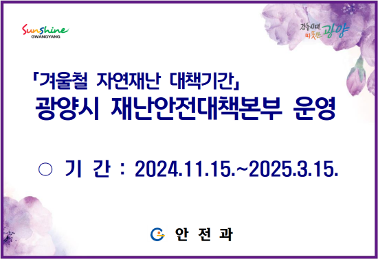 (전남=NSP통신) 김성철 기자 = 광양시가 시민의 소중한 생명과 재산을 지키기 위해 겨울철 자연재난 대책을 마련하고 총력 대응에 나선다.