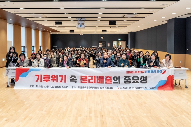 (경기=NSP통신) 조현철 기자 = 경기 오산시(시장 이권재)가 탄소중립 녹색성장 시민교육의 일환으로 ‘분리배출로 만드는 녹색지구’를 주제로 10일 경기도여성단체협의회 오산시지회 회원 100여 명을 대상으로 교육을 실시했다,