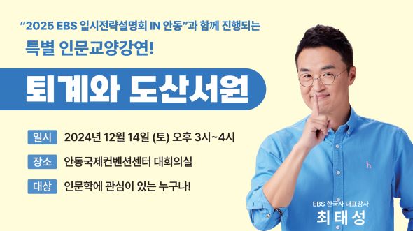 이번 강연은 도산면에 위치한 안동국제컨벤션센터의 대회의실에서 ‘2025 EBS 입시전략설명회’와 연계해 진행되고 인문교양 강연은 오후 3시부터 약 1시간 동안 진행될 예정이다.