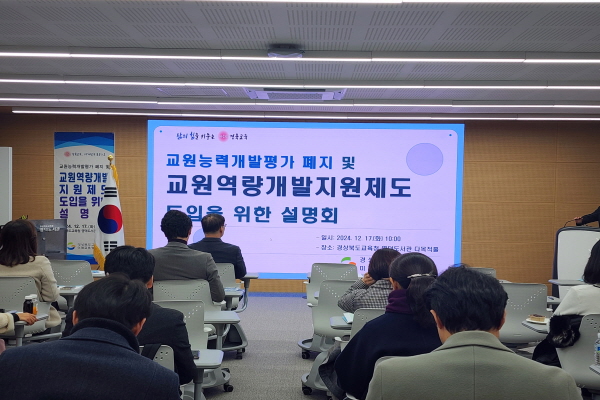 (경북=NSP통신) 조인호 기자 = 경상북도교육청(교육감 임종식)은 17일 영덕군에 있는 경상북도교육청 영덕도서관 다목적홀에서 업무 담당 장학사와 교육연구사 등 46명을 대상으로 ‘교원역량개발지원제도 도입 후속 조치 지원 설명회’를 개최했다.