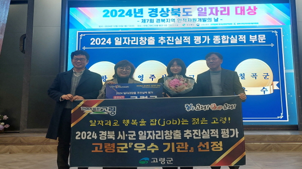고령군은 지난 23일 경상북도에서 주관하는 ‘2024 시·군 일자리 창출 추진실적 종합평가’에서 작년 최우수 기관 선정에 이어 올해 우수기관으로 선정돼 수상함으로써 일자리 창출을 통한 지역경제 활성화 성과를 2년 연속 대내외적으로 인정받는 쾌거를 달성했다. (사진 = 고령군)
