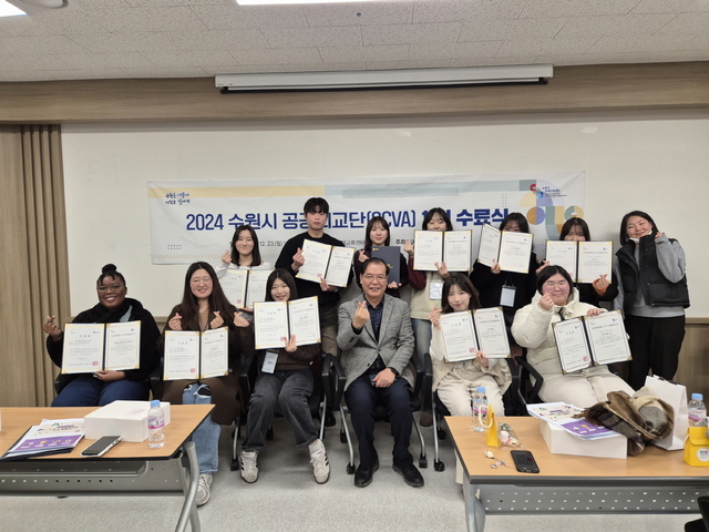 (경기=NSP통신) 조현철 기자 = 경기 수원시국제교류센터가 23일 센터 세미나실에서 ‘수원시 공공외교단(SCVA) 11기’ 수료식을 열고 단원 17명에게 수료증을, 우수활동자 4명에게 상장을 수여했다.