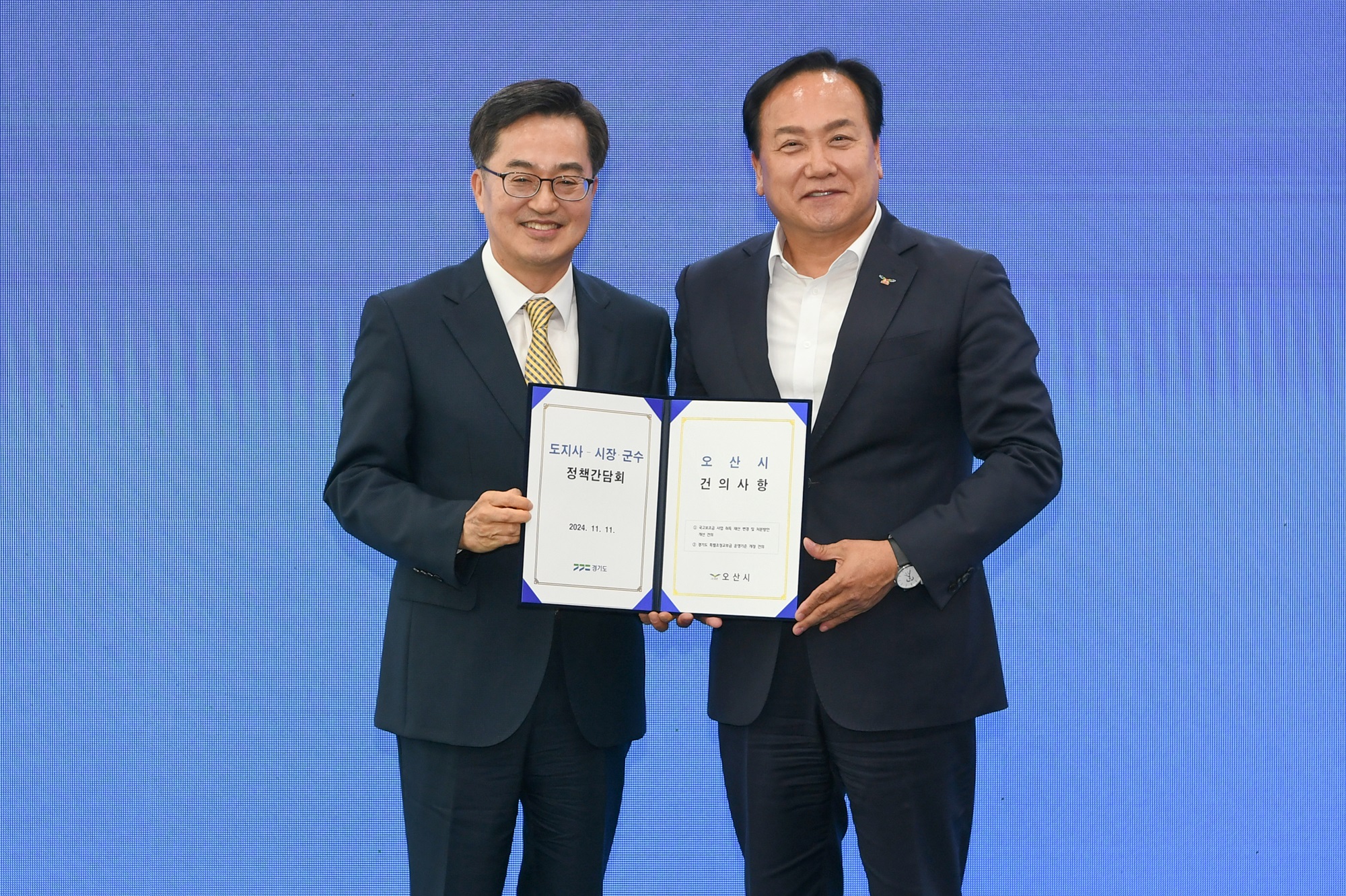 이권재 오산시장(오른쪽)이 김동연 경기도지사와 사진촬영을 하는 모습. (사진 = 오산시)