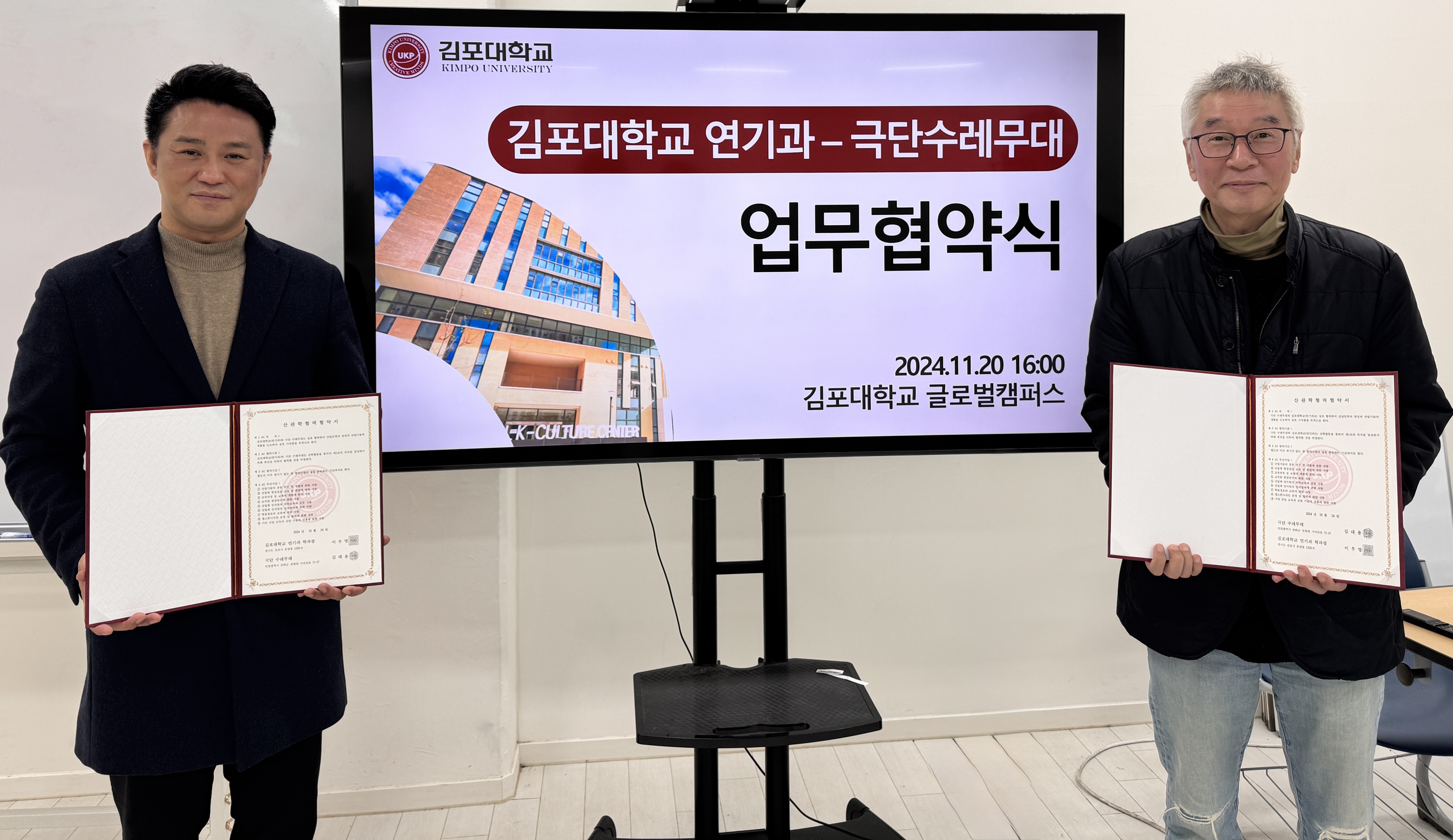 협약식은 김포한강신도시 운양동 소재 김포대학교 글로벌캠퍼스에서 진행됐으며 김포대학교 연기과 이우영 학과장과 극단 수레무대 김태용 대표 등 양 기관 관계자들이 참석해 상호 협력 방안을 논의했다.