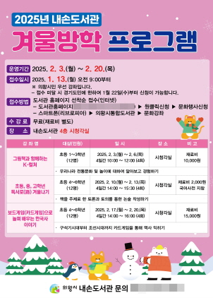 (경기=NSP통신) 김해종 기자 = 경기 의왕시(시장 김성제) 내손도서관은 2025년 겨울방학을 맞아 초등학생을 위한 다양한 프로그램을 운영한다.