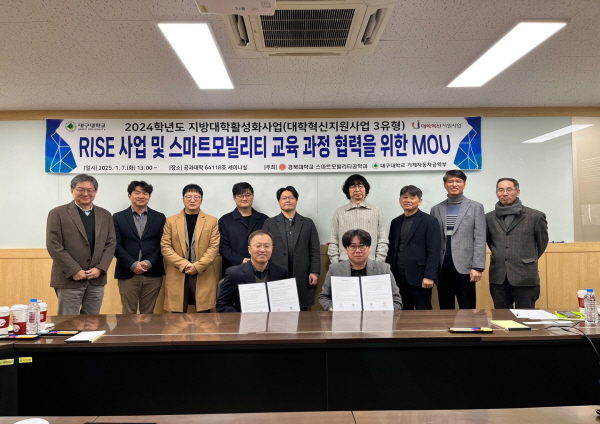(경북=NSP통신) 김대원 기자 = 대구대 기계자동차공학부(학부장 유재현)와 경북대 스마트모빌리티공학과(학과장 이영중)가 지난 7일 대구대 공과대학에서 미래 모빌리티 분야의 우수인재 양성을 위한 업무협약(MOU)을 체결했다.