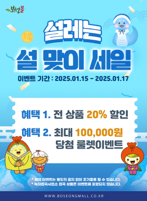 이번 할인행사는 ‘보성몰’을 이용하는 모든 고객을 대상으로 20% 할인(일부 품목 제외) 룰렛 이벤트(2000~10만 포인트 적립) 등 설레는 설 명절을 맞이해 특별한 혜택이 제공된다.