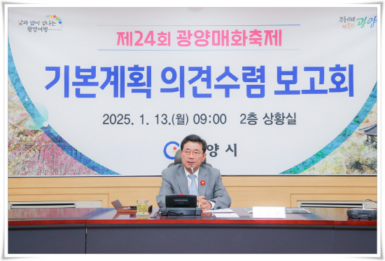 광양시청 상황실에서 지난 13일 정인화 광양시장을 비롯해 관계부서장 30여 명이 참석한 가운데 제24회 광양매화축제 기본계획(안) 의견수렴 보고회가 열렸다.
