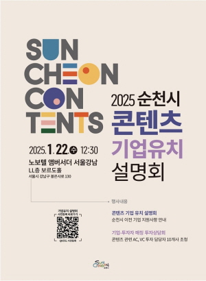 (전남=NSP통신) 남정민 기자 = 전남 순천시(시장 노관규)가 오는 22일 오후 12시 30분 서울 강남(노보텔 앰배서더)에서 ‘2025 순천시 콘텐츠 기업유치 설명회’를 개최한다고 15일 밝혔다.