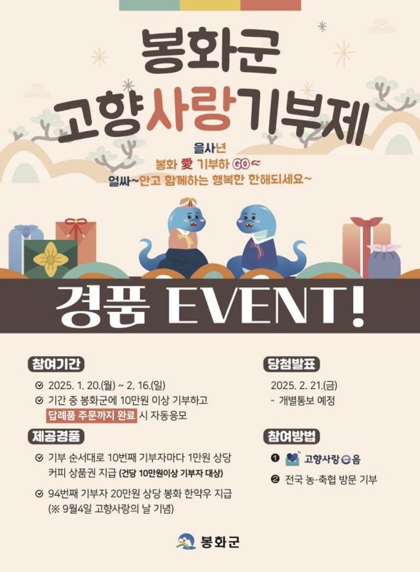 박덕명 재정과장은 “봉화를 응원하고 사랑하는 마음으로 기부해주신 모든분들께 감사의 마음을 전하고자 설 명절 이벤트를 진행하게 됐다”며 “올해도 고향을 사랑하는 많은 분들의 관심과 따뜻한 참여로 고향사랑기부제가 더욱더 활성화되길 기대한다”고 말했다.