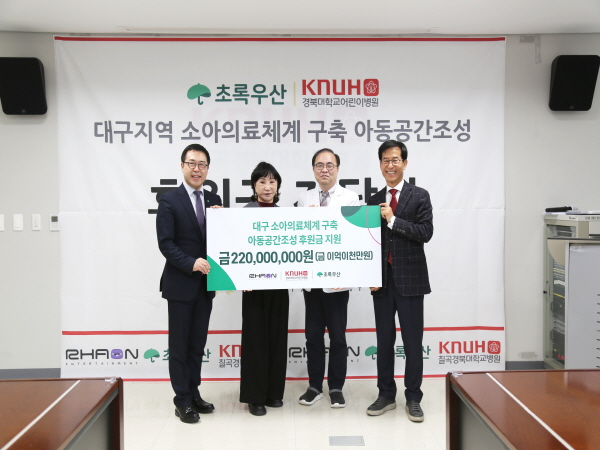 이에 박성식 칠곡경북대학교병원장은 “병원 내·외부 아동공간 조성을 위해 후원금 지원을 해주신 라온엔터테인먼트 박재숙 대표이사님 및 초록우산 측에 깊은 감사를 드린다”며 “환아들이 우리병원에서 편안하게 진료받을 수 있도록 더욱더 최선을 다하겠다”고 화답했다.