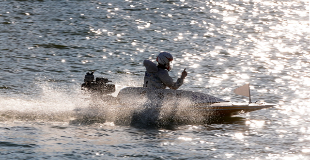 NSP통신-미사리 경정장에서 열린 경정 경주에서 우승을 차지한 선수가 손가락을 치켜들며 기뻐하고 있다. (사진 = 국민체육진흥공단)