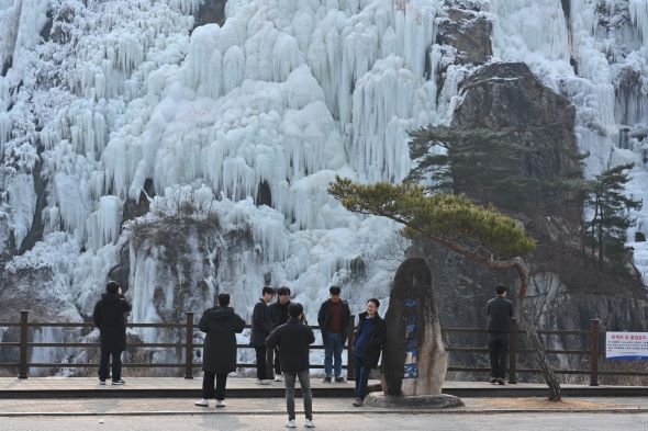 겨울철 용혈폭포는 꽁꽁 얼어붙은 빙벽이 신비로운 분위기를 연출하며 특유의 차가운 매력을 뽐내고 있어 관광객의 발길이 이어지고 있다.