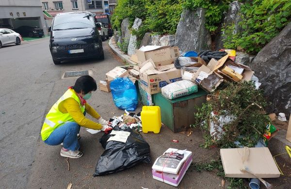 NSP통신-불법투기 감시원이 종량제 봉투를 사용하지 않고 배출한 쓰레기를 단속하고 있다. (사진 = 여수시)