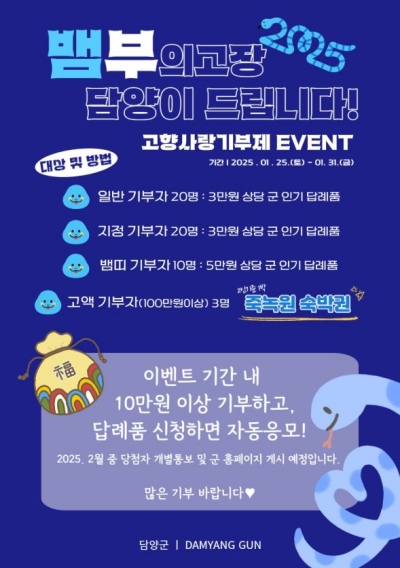 (전남=NSP통신) 김용재 기자 = 담양군(군수 이병노)이 민족 대명절 설을 맞아 고향사랑 기부 활성화를 위한 ‘뱀부(Bamboo)의 고장, 담양이 드립니다, 푸른 뱀의 해 답례품 추가 증정 이벤트’를 진행한다.