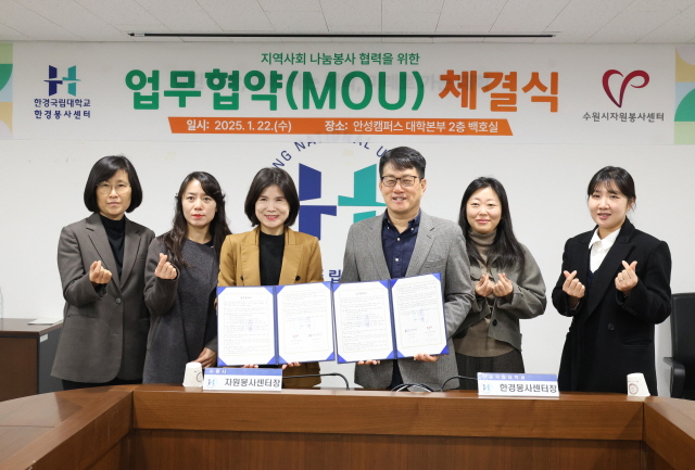 (경기=NSP통신) 김병관 기자 = 한경국립대학교(총장 이원희)는 수원시자원봉사센터(센터장 최영화)와 22일 안성캠퍼스에서 ‘지역사회의 취약계층 나눔봉사 확대’를 위한 업무협약을 체결했다.
