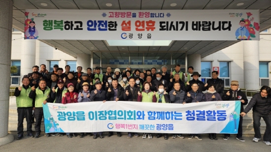 권회상 광양읍장은 “설을 맞아 깨끗한 광양읍 만들기에 참여해주신 광양읍 이장협의회와 공직자들에게 감사하다”며 “지친 몸과 마음을 이끌고 오는 귀향객 및 휴가차 방문하는 관광객들께서는 광양읍에서 쾌적한 마음으로 풍성하고 즐거운 설 명절을 보내고 가시길 바란다”며 명절 인사를 전했다.