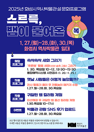 (경기=NSP통신) 조현철 기자 = 경기 화성시 역사박물관이 설 연휴인 오는 27일부터 30일까지 설날 문화프로그램 ‘스르륵, 뱀이 물어온 복’을 운영한다.