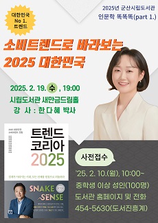 (전북=NSP통신) 김광석 기자 = 전북 군산시립도서관은 2025년 인문학 특강의 시작으로 ‘트렌드 코리아 2025’ 공동저자인 한다혜 작가를 초청, ‘소비트렌드로 바라보는 2025 대한민국’이라는 주제로강연을 운영한다.