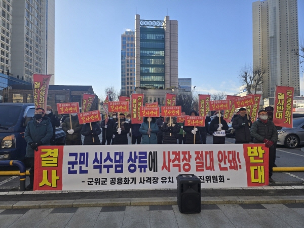 (경북=NSP통신) 조인호 기자 = 군위군공용화기사격장 반대추진위원회는 6일 영하의 날씨에도 대구시청에서 집회를 갖고 대구시와 대구정책연구원에 3가지 요구조건을 제시하는 결의문을 전달했다.