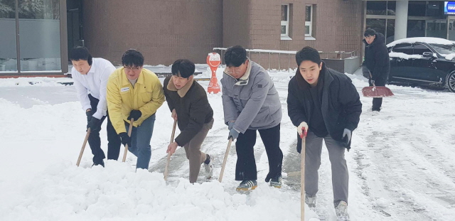 이종원 운영위원장과 의회사무국 직원들이 제설작업을 하고 있다. (사진 = 평택시의회)