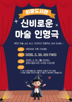 (전남=NSP통신) 김성철 기자 = 광양희망도서관이 2월 26일 오후 5시, 도서관 꿈나무극장에서 어린이와 가족을 대상으로 ‘신비로운 마술 인형극’ 공연을 연다.