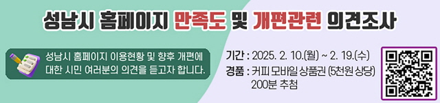 (경기=NSP통신) 김병관 기자 = 경기 성남시(시장 신상진)는 오는 19일까지 시 홈페이지 개편과 관련한 시민 온라인 설문조사를 한다.