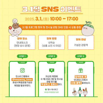 3·1절을 기념하는 SNS 인증 이벤트도 진행된다. 행사 당일 기념관을 방문한 관람객이 화성시독립운동기념관 공식 인스타그램 계정을 팔로우한 후 3·1절 프로그램 참여 및 전시실 관람 후기를 개인 SNS에 업로드하면 된다.