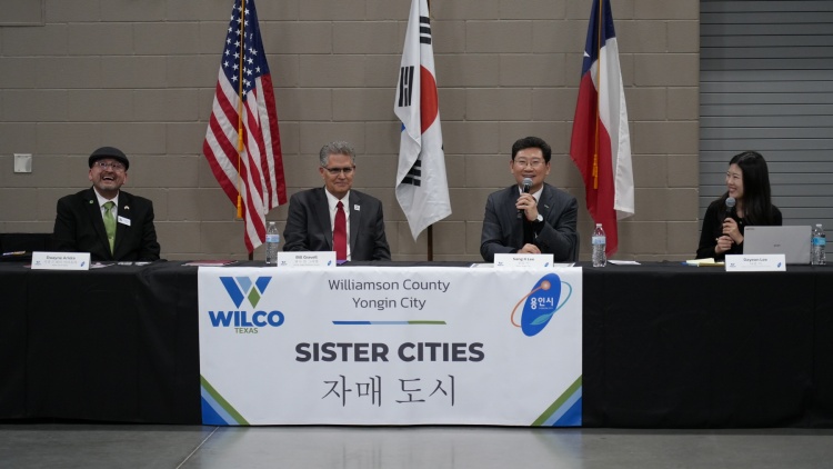 이상일 용인특례시장이 지난달 9일 미국 윌리엄슨 카운티를 방문해 자매결연 협약서에 서명하고 인사말을 하고 있다. 이 자리에는 빌 그래벨 윌리엄슨 카운티청장(왼쪽 두번째)과 드웨인 아리올라 테일러시 시장(왼쪽)이 참석했다. (사진 = 용인특례시)