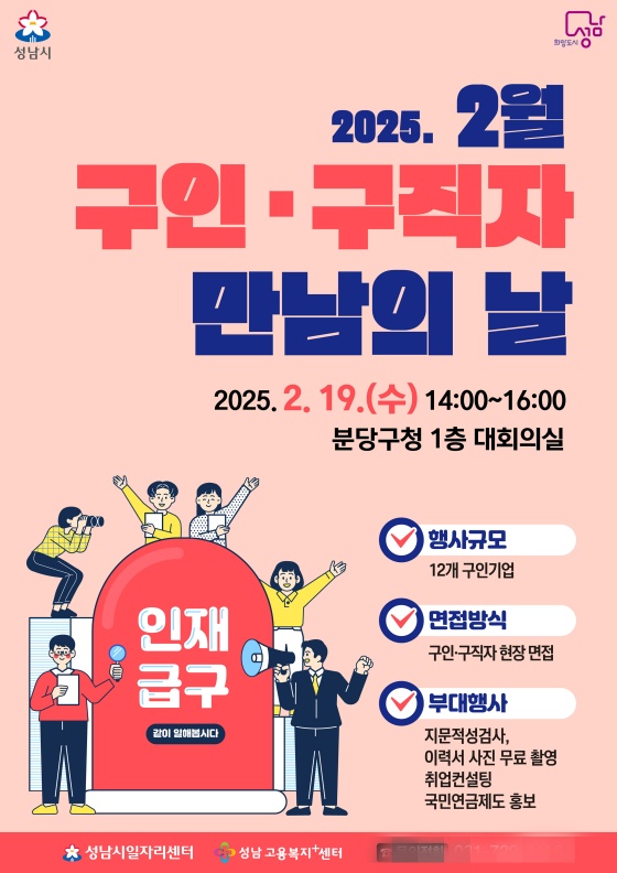 (경기=NSP통신) 김병관 기자 = 경기 성남시(시장 신상진)는 오는 19일 오후 2시부터 4시까지 분당구청 1층 대회의실에서 올해 첫 ‘구인·구직자 만남의 날’ 행사를 진행한다.