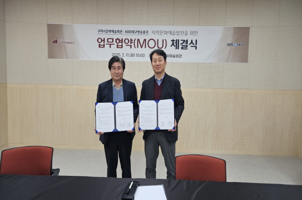 구미시문화예술회관은 지난 11일 KBS대구방송총국과 지역문화예술 발전을 위한 업무협약(MOU)을 체결했다. 이번 협약을 통해 양 기관은 문화예술 프로그램 공동 제작 및 홍보 협력을 강화하며 지역사회 공공 발전에 기여할 계획이다.
