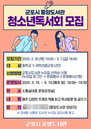 독서회별 참여 인원은 각 15명으로, 2025년 2월 20일 10시부터 군포시도서관 누리집을 통해 신청할 수 있고 정원 초과시 추첨을 통해 참가자를 확정한다.